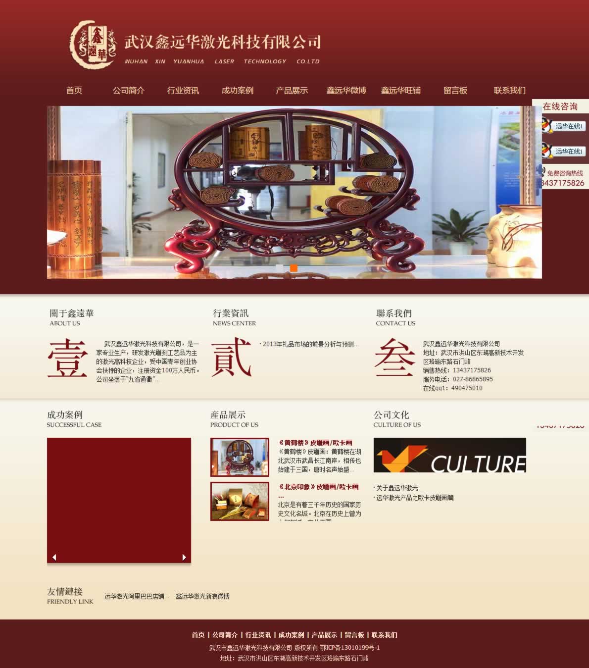 武漢鑫遠(yuǎn)華激光科技有限公司,是一家專業(yè)生產(chǎn),研發(fā)激光雕刻工藝品為主的激光高科技企業(yè),受中國青年創(chuàng)業(yè)協(xié)會扶持的企業(yè),注冊資金100萬人民幣。公司坐落于“九省通衢”素有“江城”美譽(yù)的武漢,位于“武漢·中國光谷”——武漢東湖高新技術(shù)開發(fā)區(qū)核心地段,依山傍水,風(fēng)光秀麗,湖泊密布,山巒起伏,地理位置優(yōu)越。