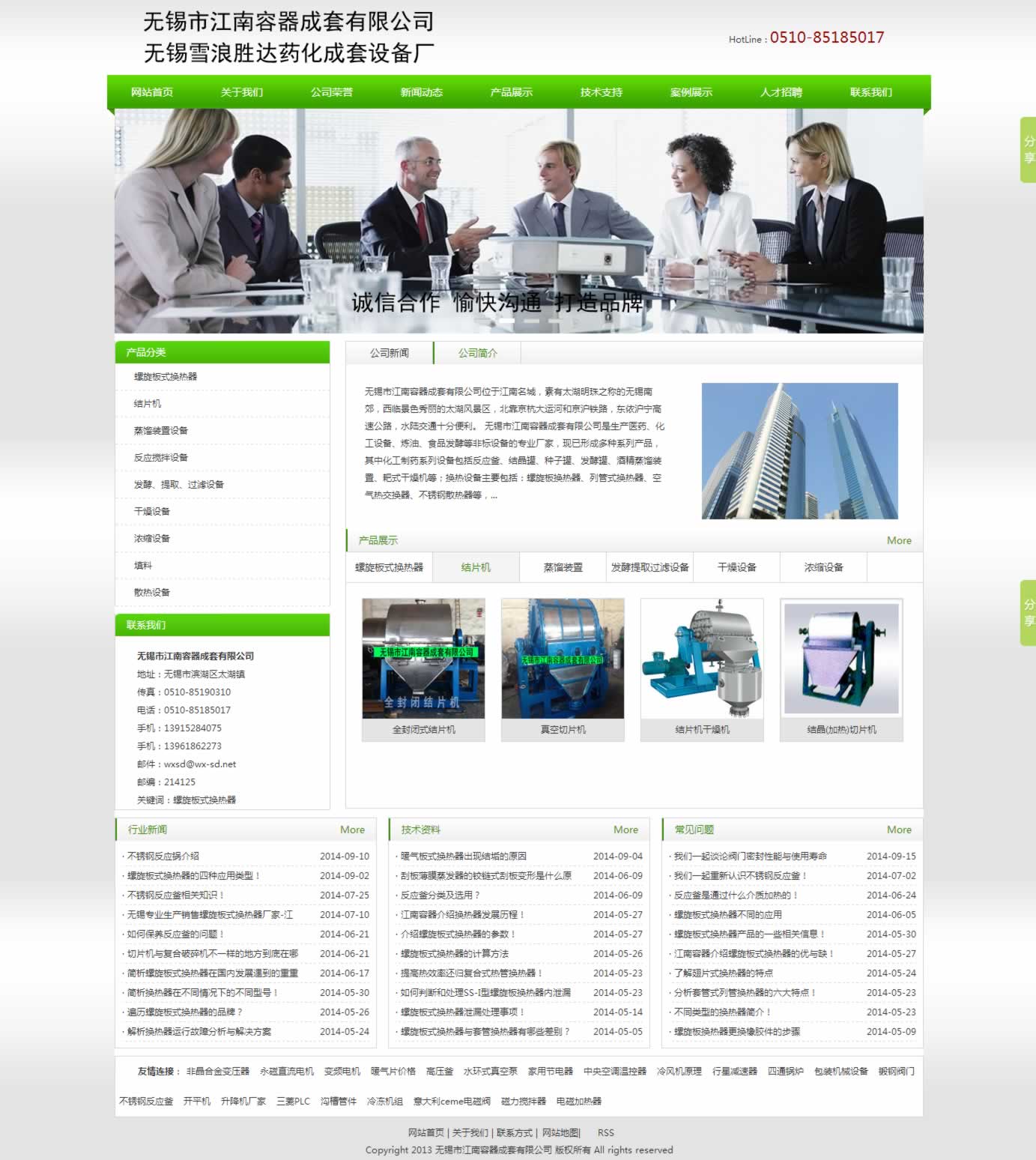 無錫市江南容器成套有限公司是生產(chǎn)醫(yī)藥、化工設(shè)備、煉油、食品發(fā)酵等非標(biāo)設(shè)備的專業(yè)廠家,現(xiàn)已形成多種系列產(chǎn)品,其中化工制藥系列設(shè)備包括反應(yīng)釜、結(jié)晶罐、種子罐、發(fā)酵罐、酒精蒸餾裝置、耙式干燥機等;換熱設(shè)備主要包括:螺旋板式換熱器、列管式換熱器、空氣熱交換器、結(jié)片機等。